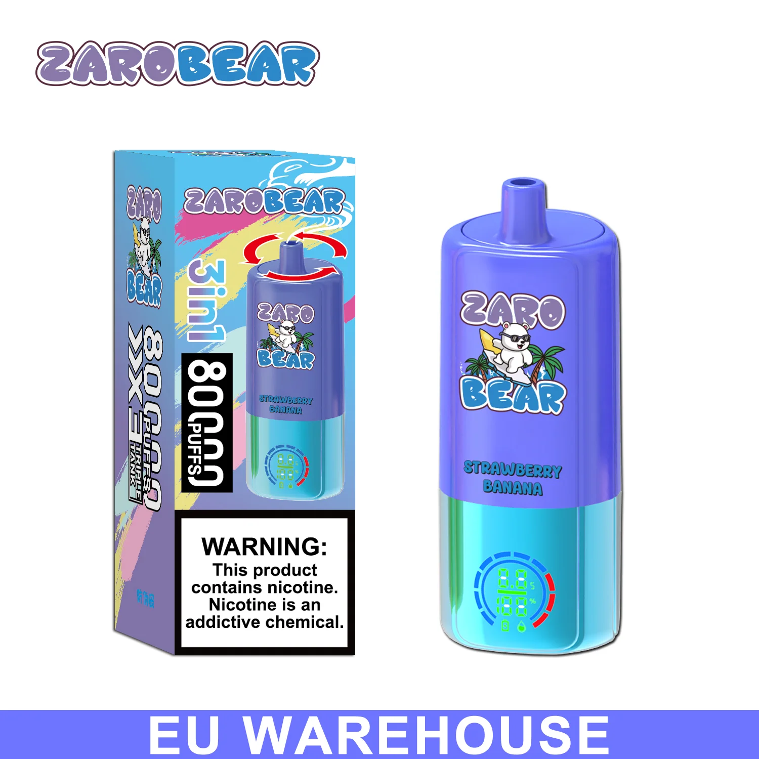 This ZARO Bear Triple flavor 80000 Puffs Disposable Vape Device E-Cigarette is one of the most innovative products in the vaping market today. It is 3in1 Vape with a rechargeable disposable vape device that has a massive 20+20+20ml E-Liquid capacity filled with  5% Nic Salt. It has a powerful 850mAh battery that can support up to 80k puffs of smooth and satisfying vapor.